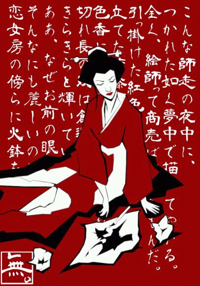 目覚めると、お栄は行灯の前に座り込んで居た。右手には朱の細筆。こんな師走の夜中に、憑かれた如く夢中で描いてやがる。全く、絵師って商売ば厄介なもんだ。